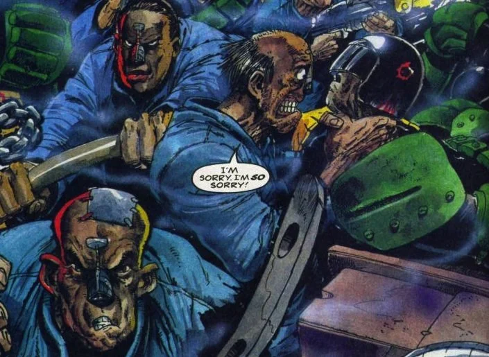 In subsequent years, Titan became home to Rico Dredd - the corrupt clone brother of Judge Dredd - and a group of judges led by Judge Grice, who violently opposed a city-wide referendum proposing a return to democracy for the people. In 2115, Grice led a mass escape from Titan, resulting in the near-total destruction of the prison complex and the brutal murders of the feared Governor Khurtz and all his subordinates.